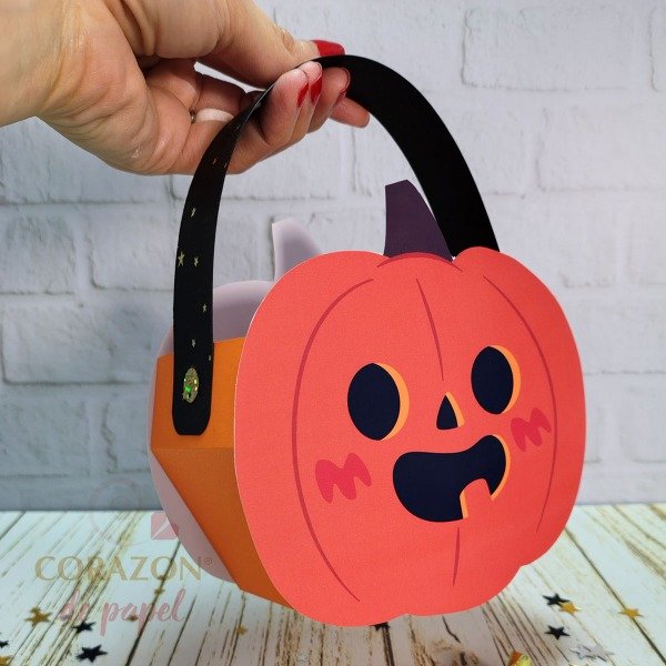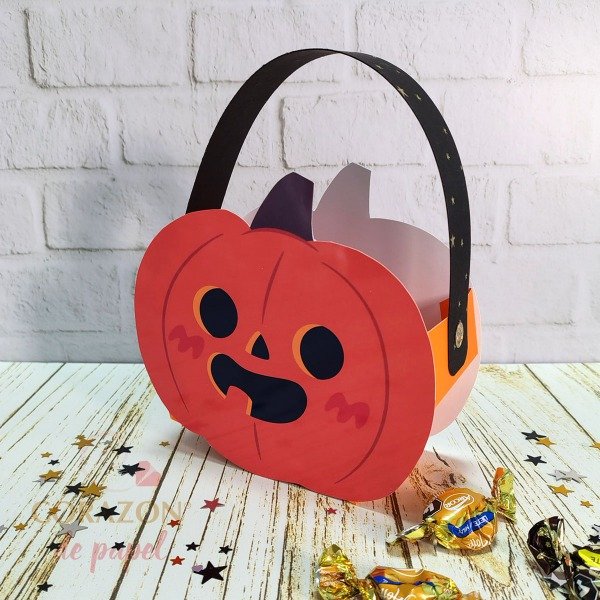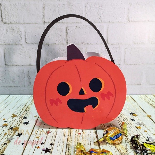 Imprimir diseño de calabaza en papel opalina o fotográfico de 230 grs aprox., y base y manija en papel de color o estampado de 180 grs aprox.